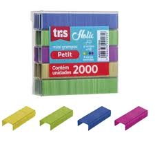 - Marca: Tris - Modelo: Mini Petit Holic Fofurices - Tipo de Grampo: Número 10 - Grampos coloridos com 4 cores: Amarelo, verde, azul e rosa - Caixa de acetato com 2000 grampos.