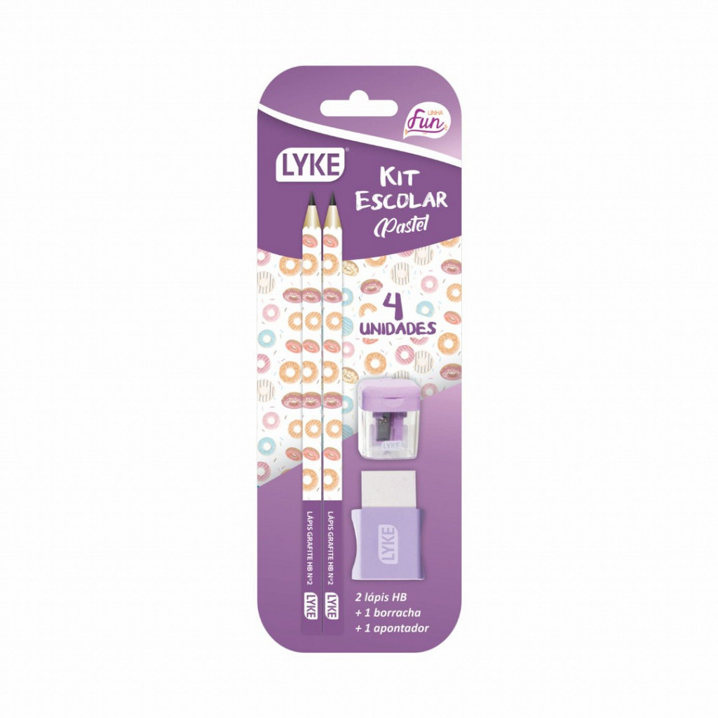 - Contém: 2 lápis grafite, 1 apontador e 1 borracha